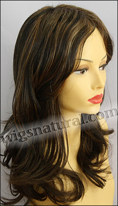 Color shown: chocolate caramel. Head size: average. Lace front wig. Front: 6.25”. Crown: 12”. Side: 11.25”. Nape: 12.75”.