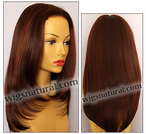 Color shown: dark red. Head size: average. lace front mono top with hand tied sides and back cap construction. Front: 9”. Crown: 12”. Side: 7”. Nape: 11”. Weight: 3.9 oz (110.5 g).