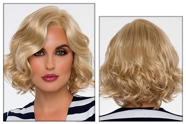 Color shown: medium blonde. Head size: average. Lace front Mono part cap construction. Front: 8.75”. Crown: 9.25”. Side: 7.25”. Nape: 3.75”. Weight: 3.25 oz (92g).