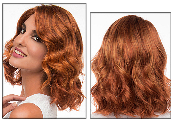 Color shown: lighter red. Head size: average. Lace front mono top cap construction. Front: 10”. Crown: 11.5”. Side: 8.75”. Nape: 15.5”. Weight: 4.3 ozs (122g).