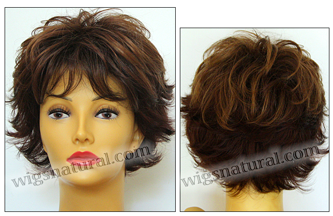 Color shown: cinnamon raisin. Head size: average. Open top wig. Front: 4.5”. Crown: 3.25”. Side: 3.25”. Nape: 2.75”.
