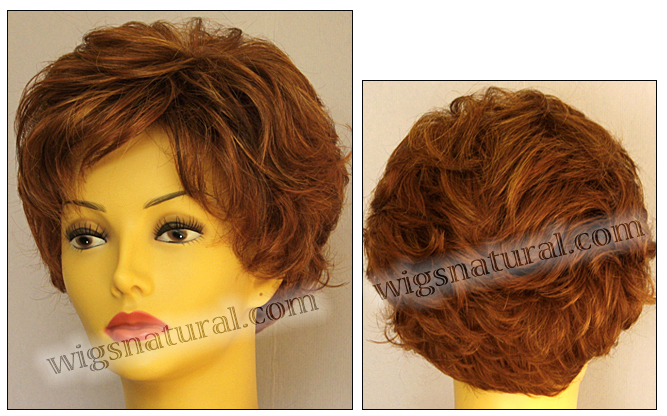 Color shown: lighter red. Head size: average. Open top wig. Color shown: lighter red. Front: 4.5”. Crown: 3”. Side: 3.25”. Nape: 2.25”. Weight: 2.4 oz (68 g)