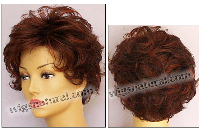 Color shown: dark red. Head size: average. Open top wig. Color shown: lighter red. Front: 4.5”. Crown: 3”. Side: 3.25”. Nape: 2.25”. Weight: 2.4 oz (68 g).