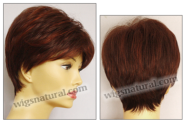 Color shown: dark red. Head size: average. Open top wig. Front: 3.25”. Crown: 3.25”. Side: 2.25”. Nape: 2”. Weight: 1.76 oz (50 g)