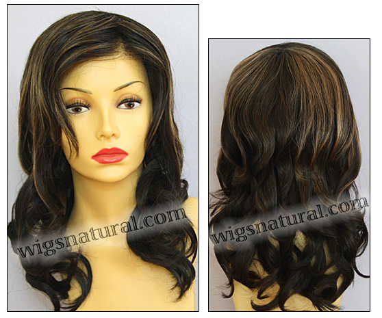 Color shown: amaretto cream. Head size: average. Lace front wig. Color shown: mocha frost. Front: 6.25”. Crown: 11.5”. Side: 8”. Nape: 11.5”.