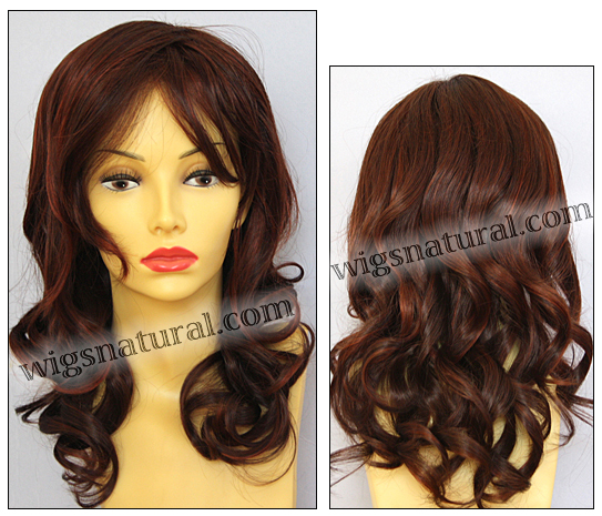 Color shown: dark red. Head size: average. Lace front wig. Color shown: mocha frost. Front: 6.25”. Crown: 11.5”. Side: 8”. Nape: 11.5”.