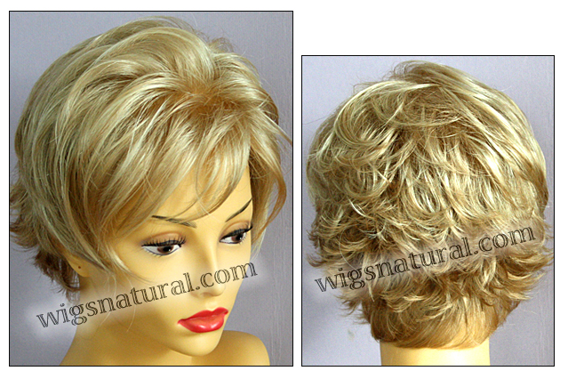 Color shown: medium blonde. Head size: average. Mono top lace front. Front: 5.25”. Crown: 4.25”. Side: 2.5”. Nape: 2.5”. Weight: 2.22 ozs (63gms).