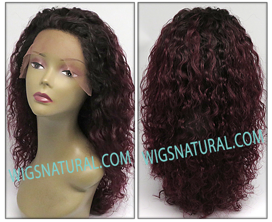 Color shown TT1B/99J. Curly hair style. Front lace from ear to ear. Hair Length: 20 inches. Weight: 5.5 oz. Hair type: 100% REMY human hair. Wig Brand: Secret Collection.