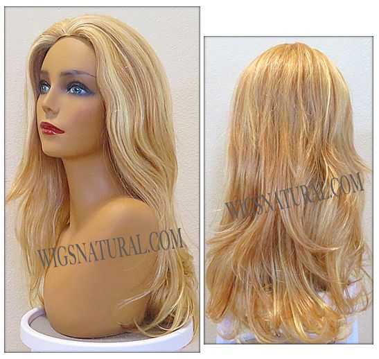 Color shown: F27/613. Mono top cap construction. Hair Length: 22 inches. Weight: 6.3 oz. Hair type: 100% human hair. Wig Brand: Elegante Wig Collection.