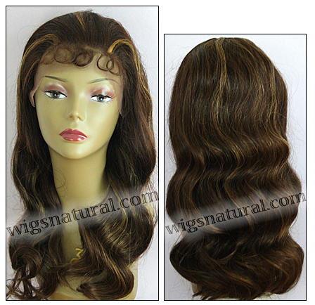 Color shown: F4/27.Body wave style with natural baby hair. Hair length: 22". Weight: 6.0 oz. Light brown front lace. Hair type: REMY 100% human hair. Wig Brand: Hollywood Hair Fantasies.