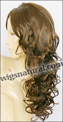 Long curly, skin top. Color Shown: #6. Weight: 7.3 oz. Wig Brand: Magic Touch Collection.
