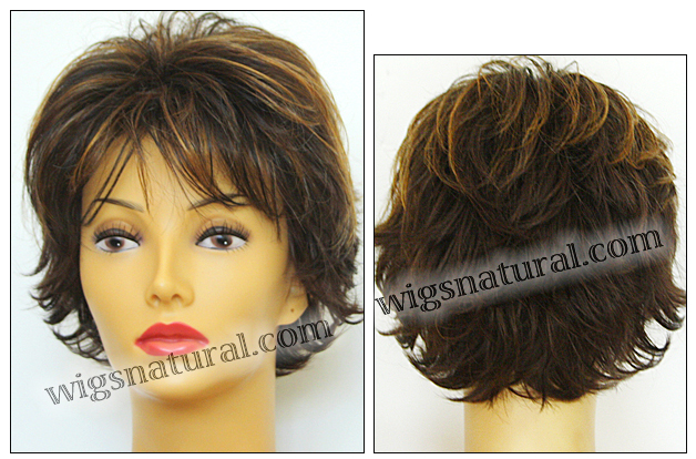 Color shown: chocolate caramel. Head size: average. Open top wig. Front: 4.5”. Crown: 3.25”. Side: 3.25”. Nape: 2.75”.