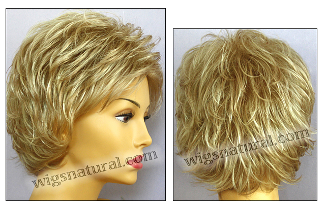 Color shown: medium blonde. Head size: average. Open top wig. Front: 4.25”. Crown: 4”. Side: 3.5”. Nape: 3.5”.