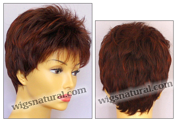 Color shown: dark red. Head size: average. Open top wig. Front: 2”. Crown: 2.5”. Side: 2”. Nape: 1.75”.